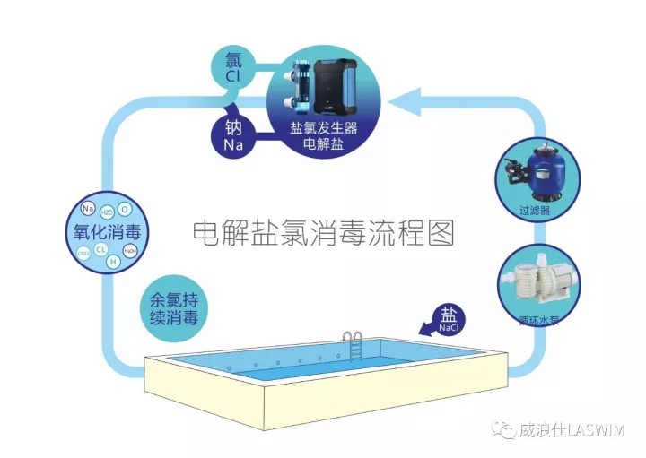 在消毒方面,由于采用的是LASWIM(威浪仕)盐氯发生器,所以它能通过电解盐的消毒方式,使用食盐为原料,在线生成活性氯,与其他种类的氯消毒相比,其费用可大大降低,具有无法比拟的经济性;其次是它的先进性,它是把食盐直接溶解于池水里,含液量与人的体液相平衡,对游泳者来说更适应、更健康。